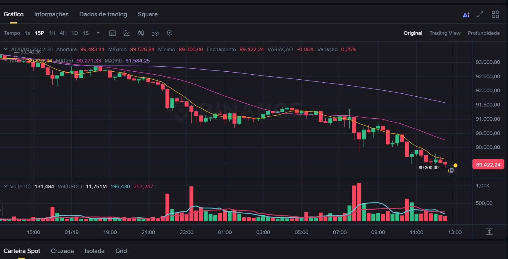 O cenário de pressão se intensificou ainda mais após o Bitcoin romper o suporte crítico dos US$ 90 mil, um nível psicológico amplamente monitorado por traders e investidores institucionais. Nas horas seguintes, o BTC chegou a ser cotado abaixo dos US$ 89 mil, movimento que acendeu alertas em todo o mercado.