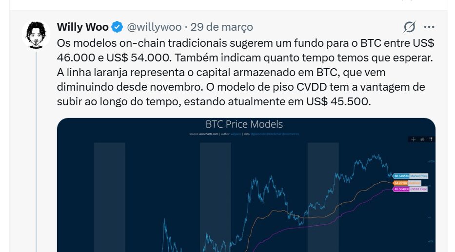 O mercado de criptomoedas segue em um momento de incerteza, e novos dados sugerem que o Bitcoin ainda pode passar por mais ajustes antes de consolidar uma recuperação. De acordo com o analista on-chain Willy Woo, a principal criptomoeda do mercado pode encontrar seu fundo de preço na faixa entre US$ 46 mil e US$ 54 mil.