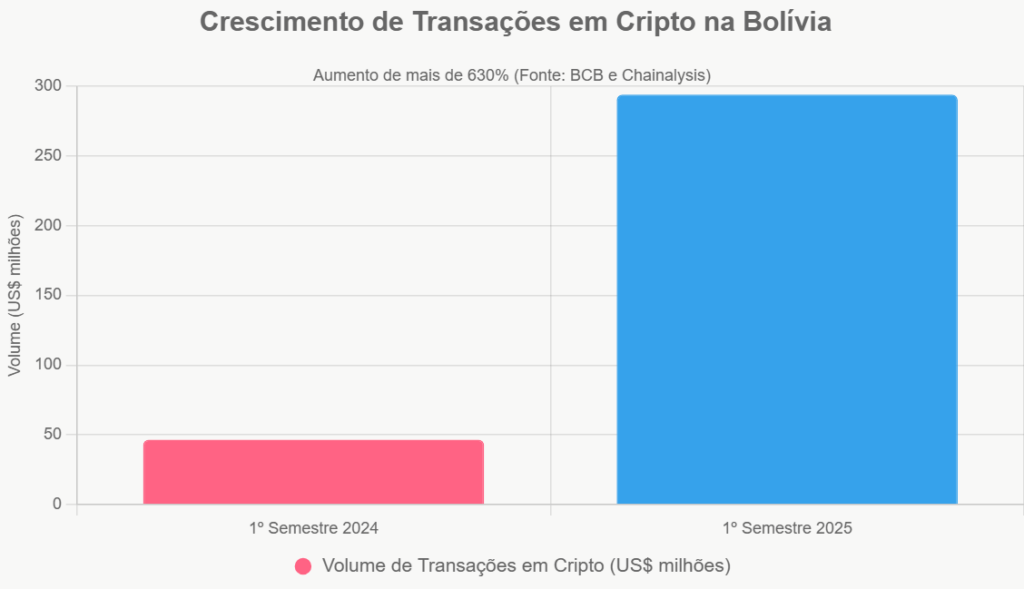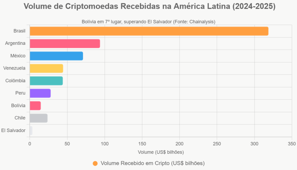Segundo dados recentes, a Bolívia foi o 7º país da América Latina em volume de criptomoedas recebidas entre julho de 2024 e junho de 2025, ficando à frente de países como El Salvador em termos de volume geral de cripto transacionado.