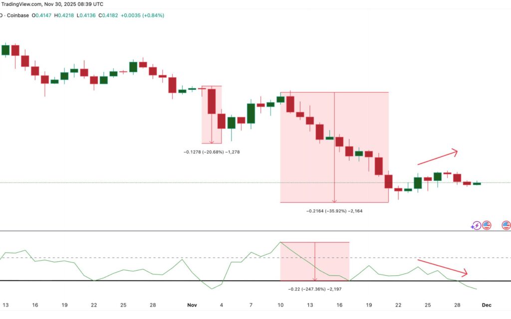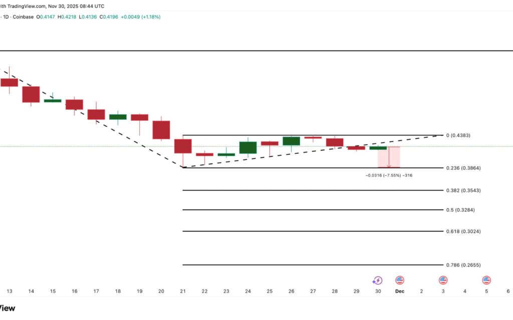 O ADA está em uma tendência de baixa clara desde 11 de novembro, sem sinais de reversão estrutural. Atualmente negociando próximo a US$ 0,419, o token testa o suporte em US$ 0,386. Se esse nível ceder, os próximos alvos de queda são US$ 0,354 e US$ 0,302, com base em projeções de extensão de tendência.