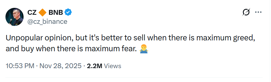 CZ diz “compre no medo, venda na ganância” — mas comunidade cripto responde com ceticismo