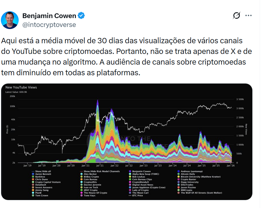 O analista de criptomoedas Benjamin Cowen, fundador do canal ITC Crypto, destacou que a tendência não está concentrada em apenas um canal ou numa mudança de algoritmo — ela reflete um declínio generalizado no engajamento cripto no YouTube e em outras plataformas sociais.