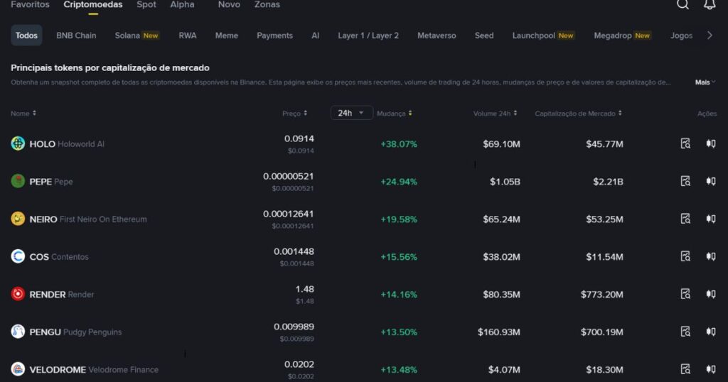 Outro destaque é o Holo AI (HOLO), com valorização que ultrapassou os 40% nas últimas 24 horas, colocando o ativo entre os principais gainers do dia.