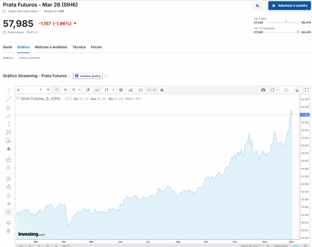 - A prata fechou o mês a US$ 58, o que representa o maior fechamento mensal dos últimos 46 anos. Esse pico ajudou a despertar o interesse de investidores de varejo no metal — e, por consequência, em sua versão tokenizada.