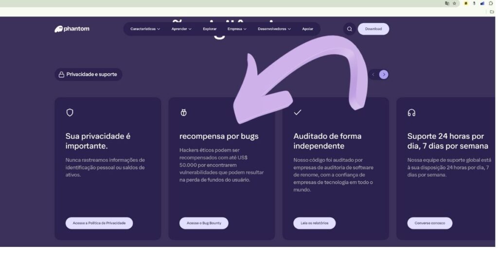 No próprio site da Phantom, na seção de segurança, eles destacam um programa de bug bounty que recompensa hackers éticos (white hat hackers) com até US$ 50.000 por descobrirem vulnerabilidades críticas que possam levar à perda de fundos dos usuários.