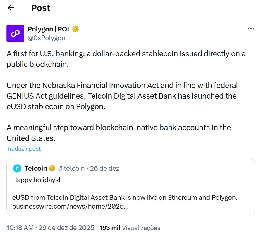 Em conformidade com a Lei de Inovação Financeira de Nebraska e com as diretrizes da Lei GENIUS federal, o Telcoin Digital Asset Bank lançou a stablecoin eUSD na plataforma Polygon.
