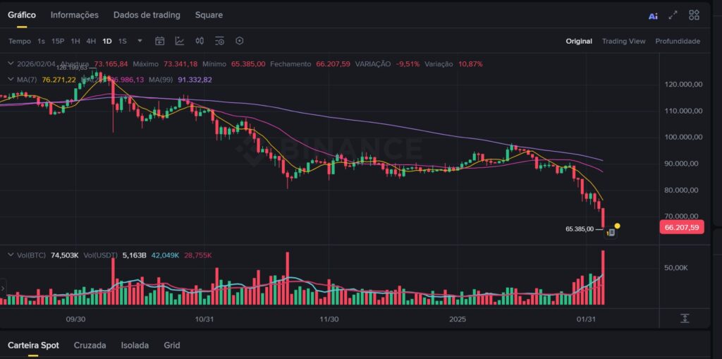 Nos últimos meses, o Bitcoin acumulou uma queda que já ultrapassa 32% em relação ao seu recorde de cerca de USD 126.000 em outubro de 2025. A criptomoeda chegou a perder valores abaixo de USD 65.000, algo que não ocorria desde novembro de 2024, gerando preocupação entre investidores institucionais e de varejo.