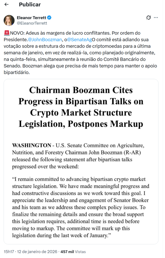 De acordo com fontes do Senado reportadas pela jornalista especializada Eleanor Terrett (Crypto in America), o principal entrave é a falta de consenso suficiente para avançar a votação. Boozman declarou explicitamente: