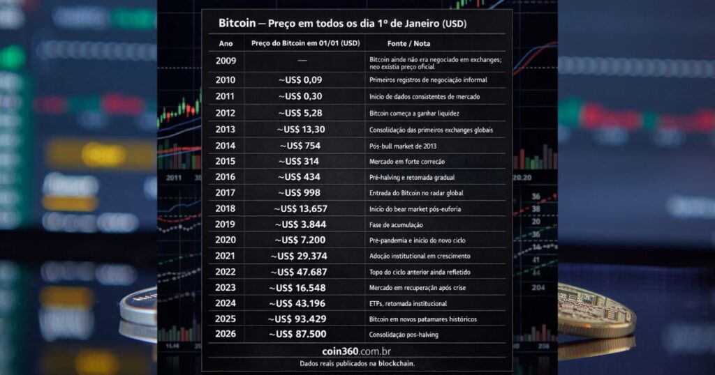 Para compreender essa transformação de forma objetiva e histórica, a equipe Coin360 realizou um levantamento detalhado do valor do Bitcoin em todos os anos, sempre no dia 1º de janeiro, criando uma das linhas do tempo mais completas já publicadas sobre o ativo.